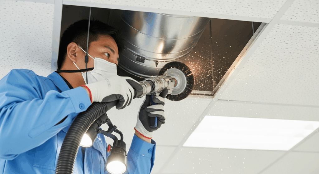 Brushing the Ducts – Special brushes clean stuck dirt from inside the ducts.