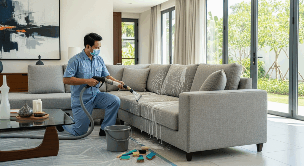 Shampoo Application – A special sofa-safe shampoo is applied to break down dirt, sweat, and stains.